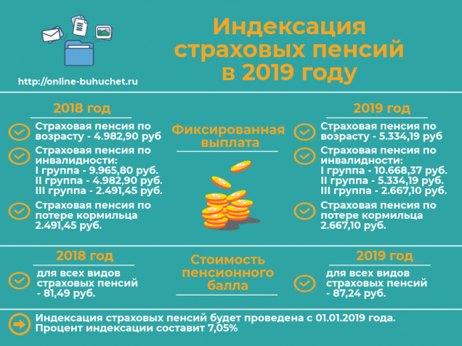 - Фиксированная оплата. Это неотъемлемая часть страховой пенсии. Его размер не зависит от того, как долго он был получателем, или от количества его пенсионных баллов. Эту сумму получают все без исключения граждане, которые в принципе имеют право на данный вид материальной поддержки. В 2019 году размер этой части пенсии составляет 5334,19 рубля. И именно она подлежит ежегодной индексации. В частности, в 2019 году его размер был увеличен на 7,05 процента.