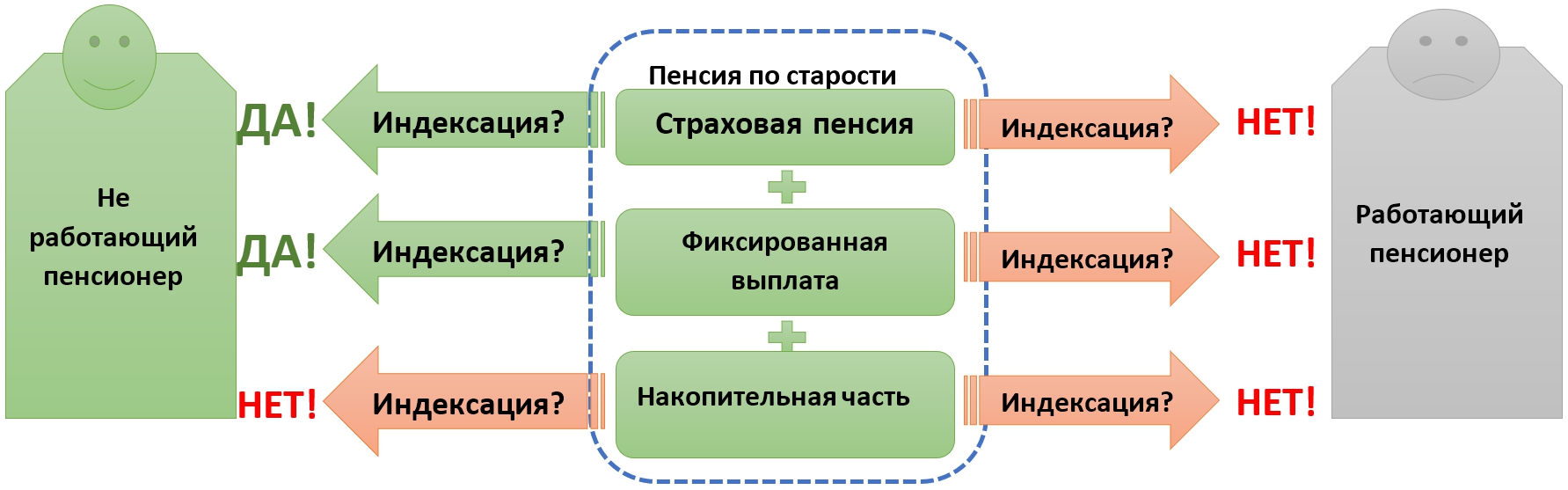 Таким образом, несмотря на вышеуказанный перерасчет, пенсионер не получает сумму индексации страховой пенсии и дополнительной фиксированной выплаты к ней. Если у вас низкий заработок, вы можете получать меньшую пенсию, чем ваш безработный коллега.