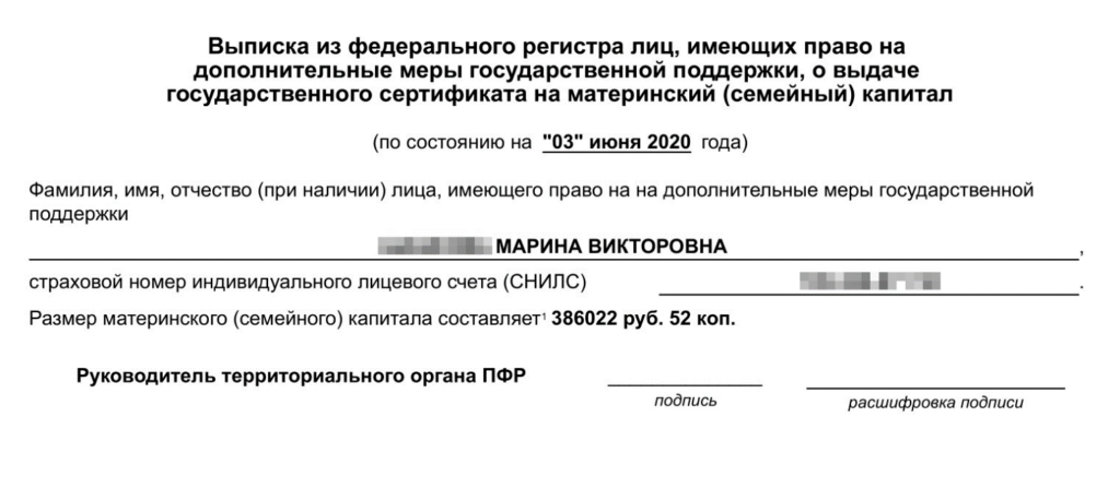 Официальное название документа — «Справка о размере (остаточного) материнского (семейного) капитала».